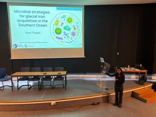 Après 3 année de travail dans le cadre des projets BINGO, MARGO et SIDEMAR, Rhéa Thoppil a soutenue sa thèse intitulée Microbial strategies of glacial iron acquisition in the Southern Ocean" devant le jury composé de Sara Beier (rapporteure), Scarlett Trimborn (rapporteure), Sophie Novilos (examinatrice), Fabien Joux (president) et Ingrid Obernosterer (directrice de thèse).